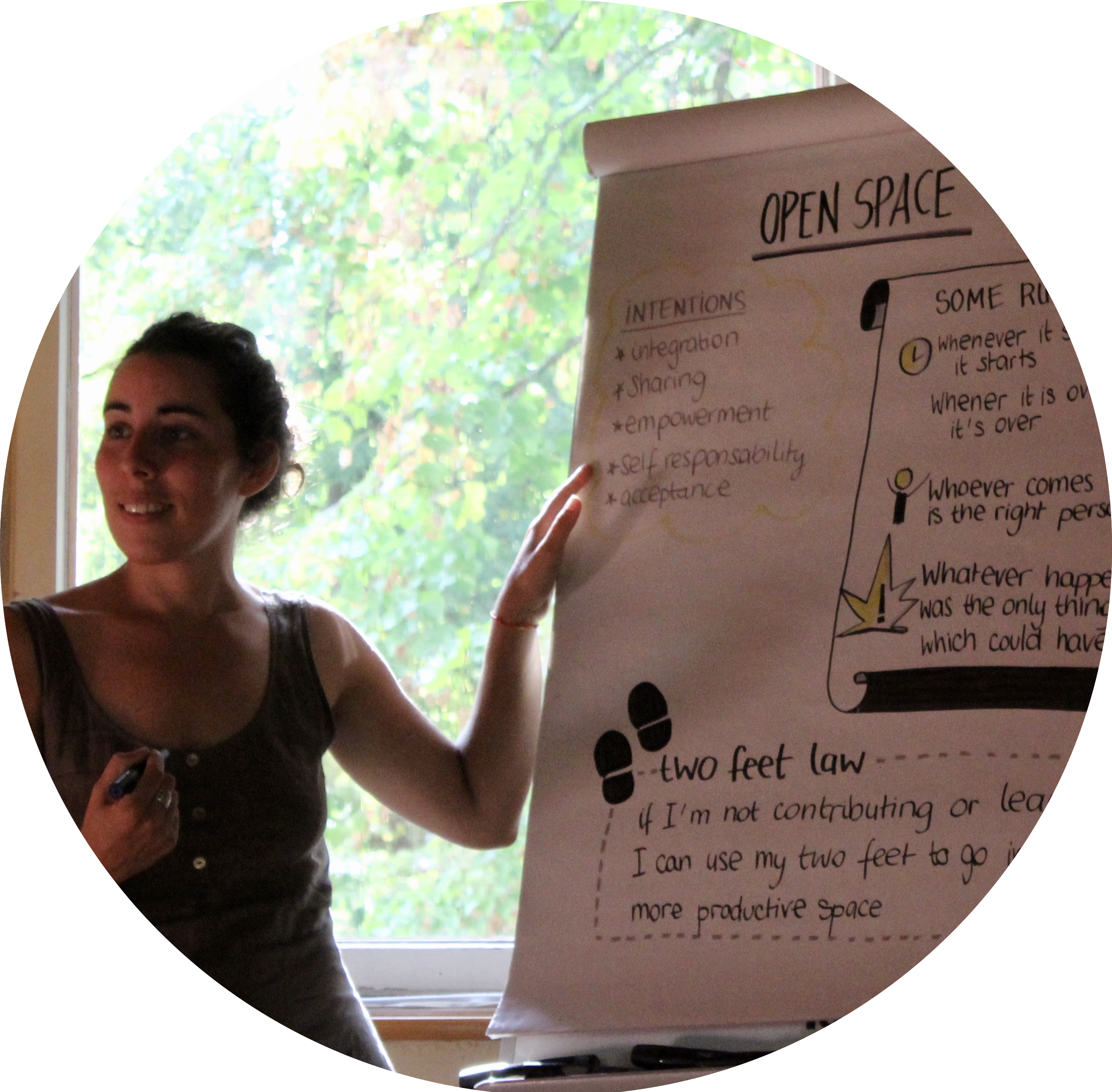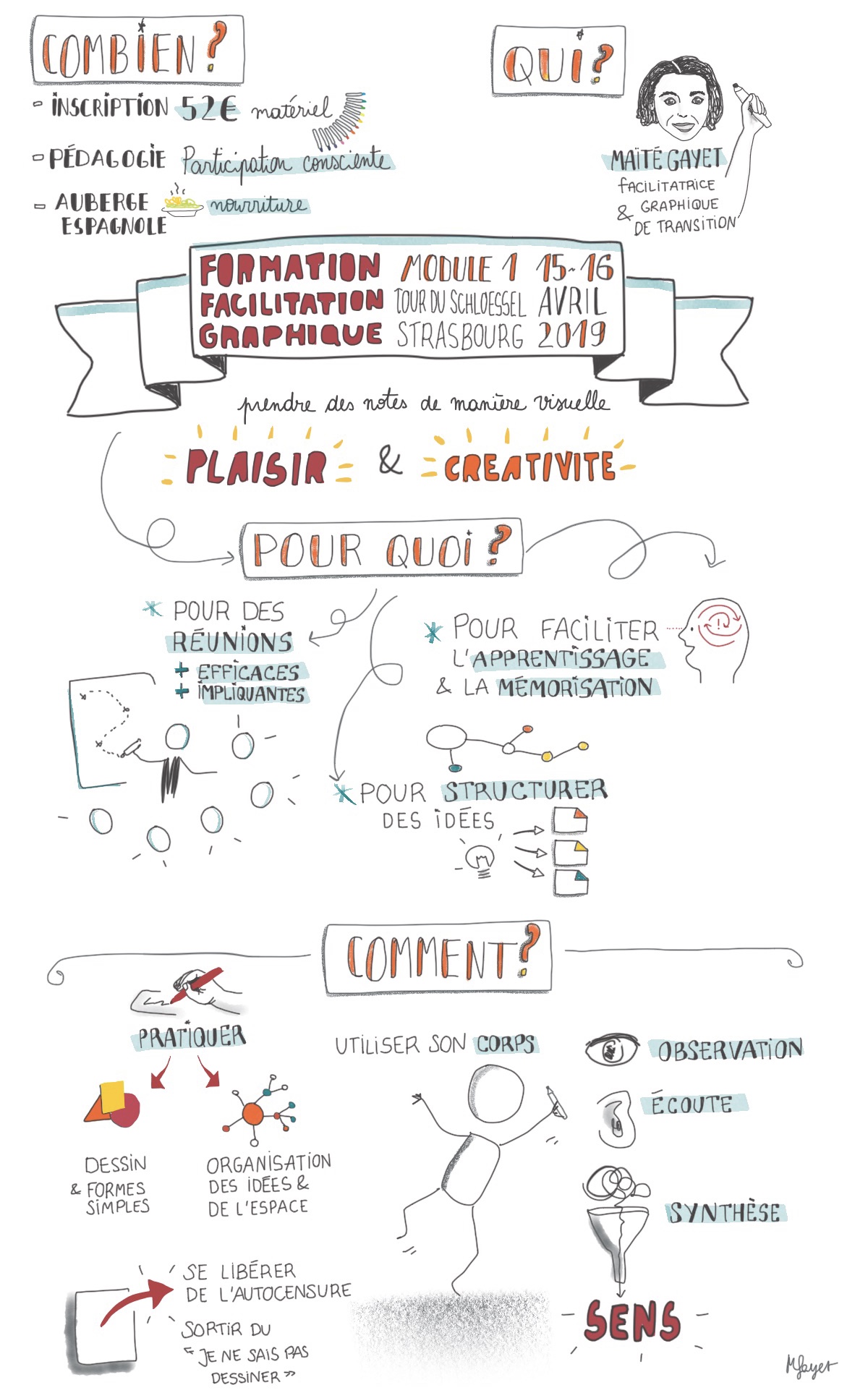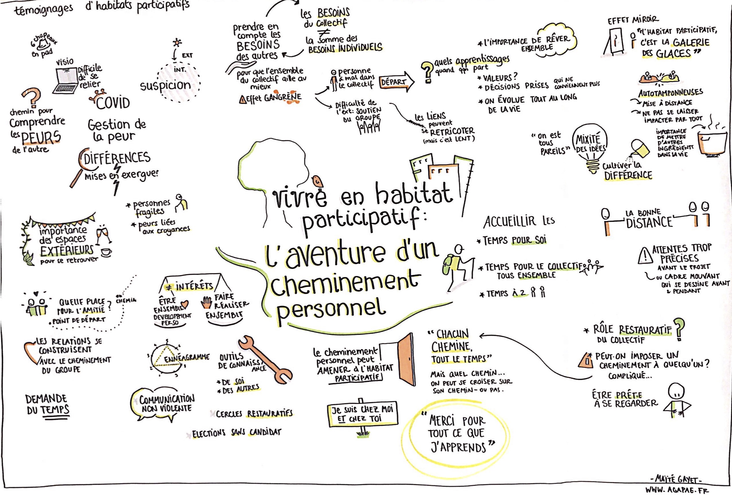 J’accompagne depuis une dizaine d’années des collectifs dans des projets d’habitat partagé et d’écolieux avec la Coopérative Oasis. Pour favoriser l’intelligence collective, mieux fonctionner en équipe, j’utilise et transmets la facilitation graphique.